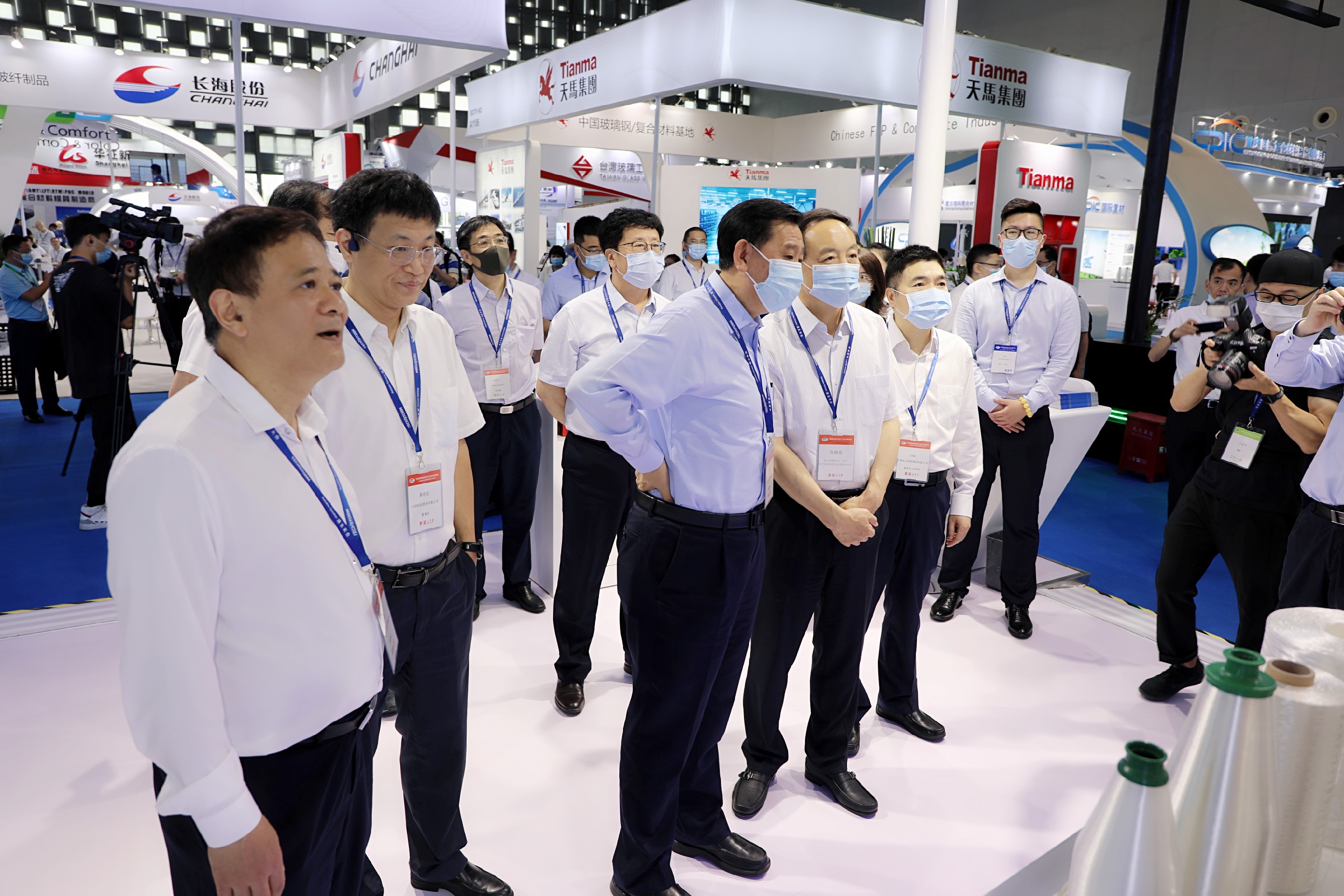 展會開幕后,中國建材集團副董事長李新華,西寧市委副書記、市長、西寧經濟技術開發區管委會主任張曉容到我公司參觀展臺、聽取匯報并慰問現場工作人員,中國復合材料集團有限公司黨委書記、董事長兼總經理劉標,公司薛忠民、宋伯廬、趙謙、趙俊山等領導陪同參觀。