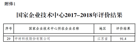 近日,國家發(fā)展改革委發(fā)布了對(duì)全國1345個(gè)國家企業(yè)技術(shù)中心2017-2018年評(píng)價(jià)結(jié)果,中材科技國家企業(yè)技術(shù)中心以91.4分獲評(píng)優(yōu)秀,名列全國第29位。
