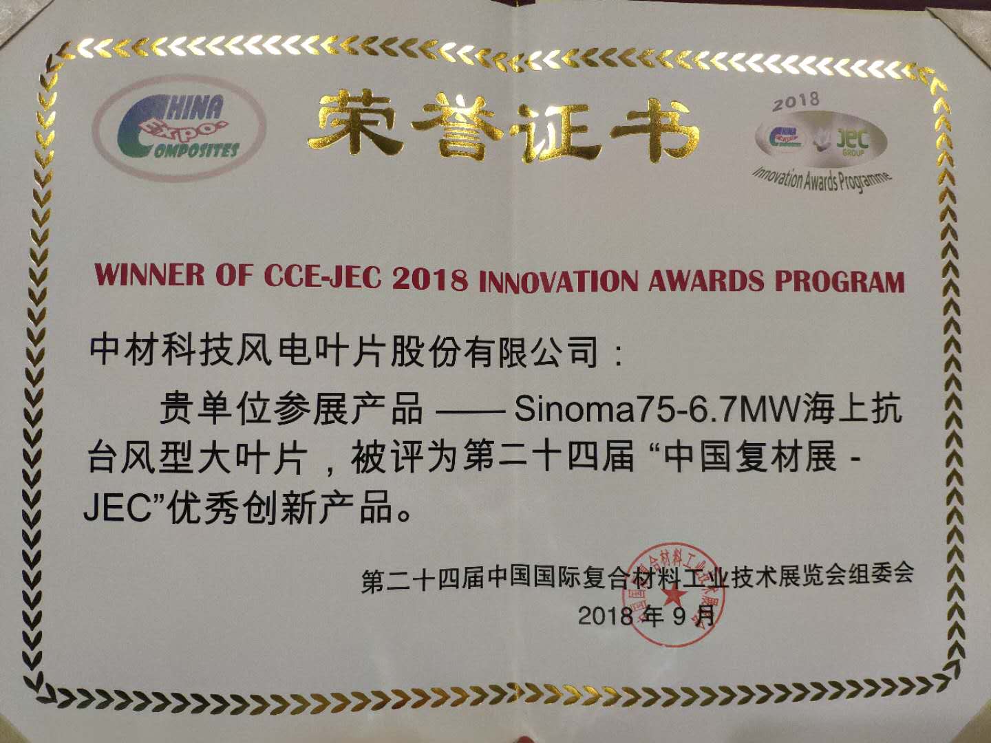 9月5日上午11點(diǎn),在2號(hào)展館新聞發(fā)布區(qū)進(jìn)行2018CCE-JEC創(chuàng)新產(chǎn)品頒獎(jiǎng)儀式,來(lái)自國(guó)內(nèi)外33家企業(yè)的42件創(chuàng)新產(chǎn)品角逐原材料、應(yīng)用、工藝與技術(shù)三大類十余項(xiàng)大獎(jiǎng)。中材科技風(fēng)電葉片股份有限公司的參展產(chǎn)品“75-6.7MW海上抗臺(tái)風(fēng)型大葉片”、北京中材汽車復(fù)合材料有限公司參展產(chǎn)品“大馬力柴油發(fā)動(dòng)機(jī)復(fù)合材料油底殼”兩項(xiàng)產(chǎn)品評(píng)為第二十四屆“中國(guó)復(fù)材展-JEC”優(yōu)秀創(chuàng)新產(chǎn)品獎(jiǎng)。公司董事長(zhǎng)薛忠民參加頒獎(jiǎng)儀式。
