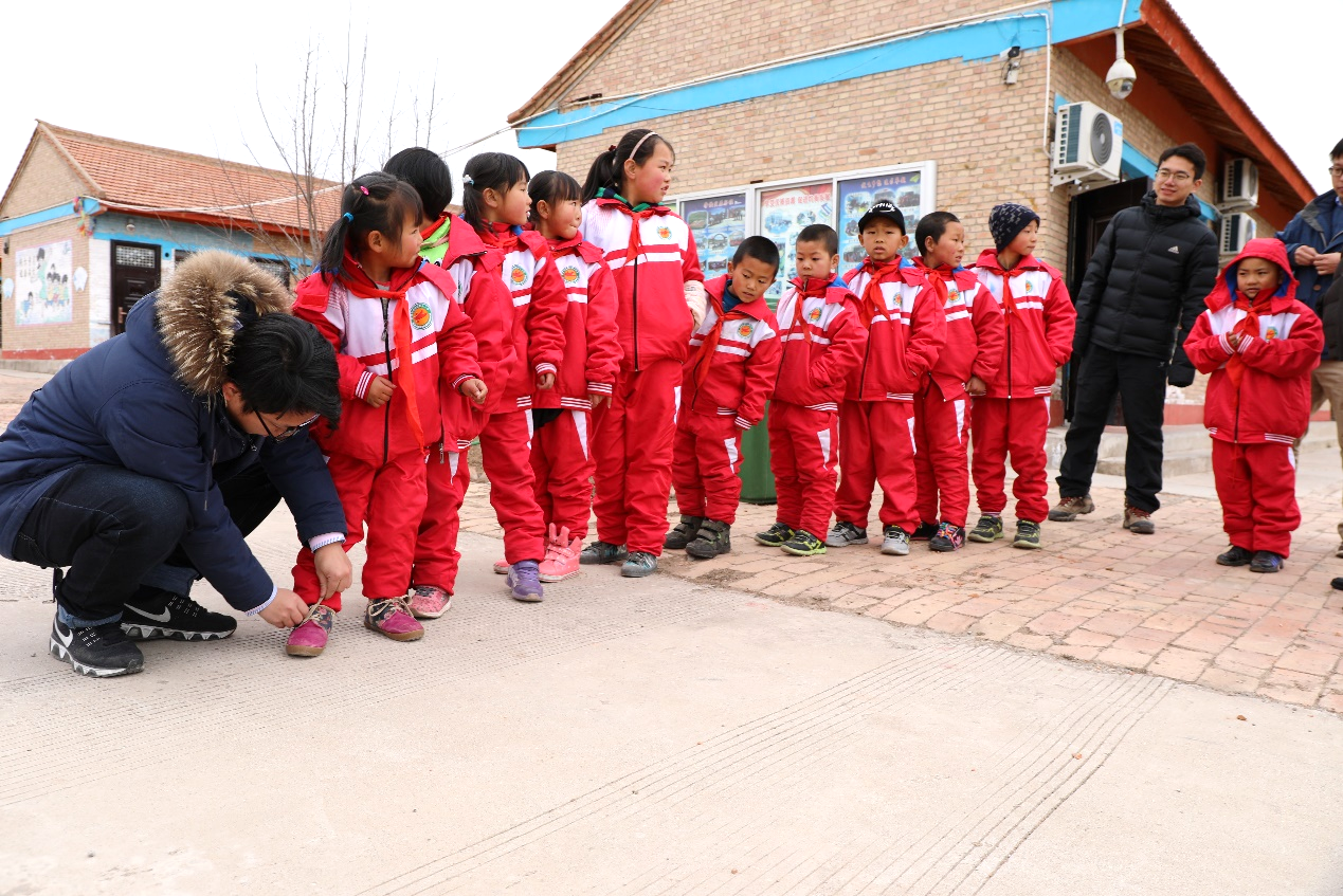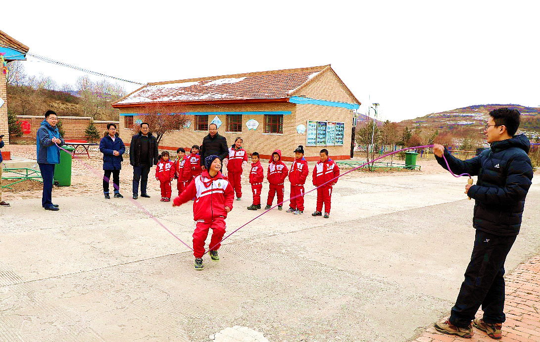 課后公司青年和孩子們一起進行體育活動,歡笑聲、加油聲在小學里回蕩。