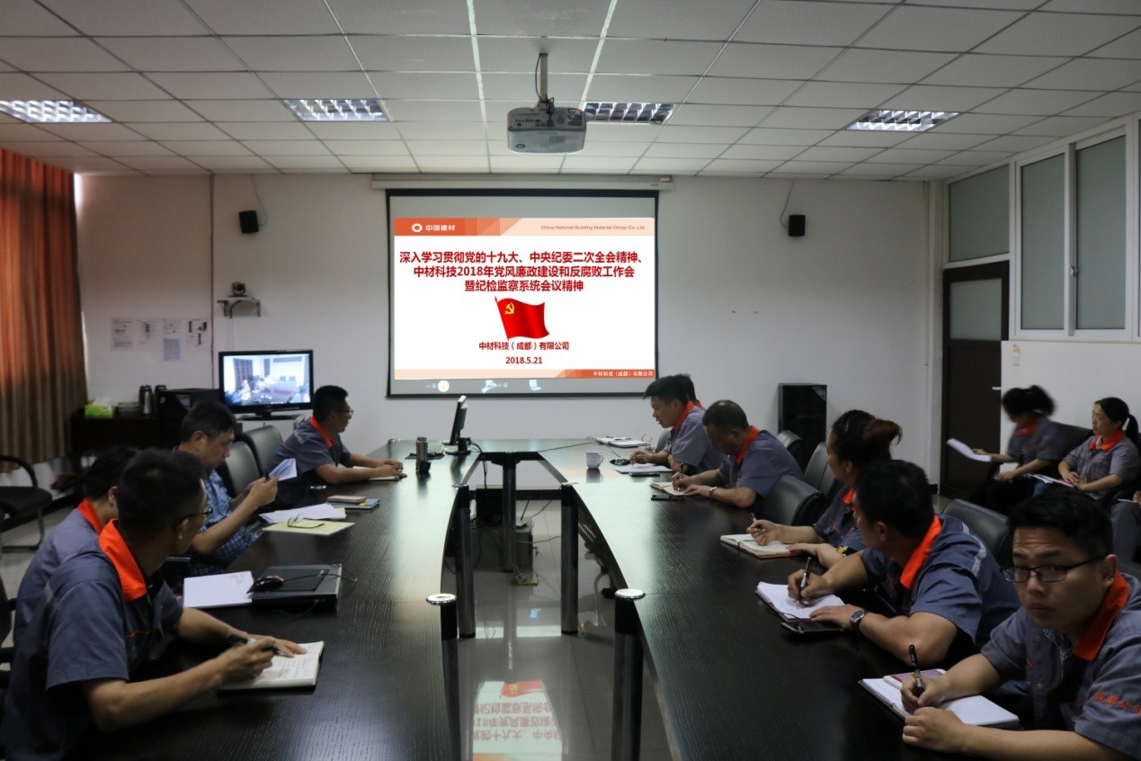 5月21日下午,成都有限組織專題會傳達學習中材科技2018年黨風廉政建設和反腐敗工作暨紀檢監察系統貫徹落實黨的十九大、中央紀委二次全會精神會議。成都、蘇州兩地視頻形式,公司領導班子、高管、中層干部及相關黨員同志共23人參加會議。會議由黨總支書記孔建軍同志主持。